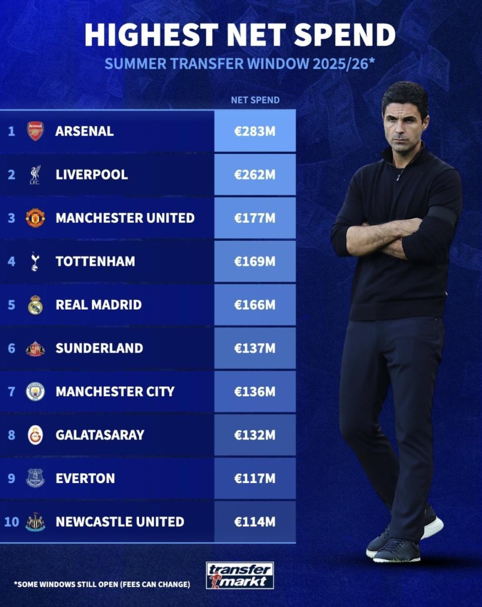 阿森纳总投入 2.94亿欧元,净投入却高达 2.83亿欧元,几乎没有卖人,基本全靠真金白银砸市场。这种模式说明他们的补强极具针对性,也透露出冲击冠军的强烈信号。